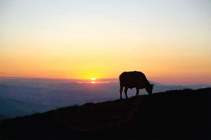南臺(tái)也被稱為花臺(tái),各種野花競(jìng)相開放,清新雅致。遠(yuǎn)眺峰巒疊嶂,漸入云端,近觀,地上完全鋪上了綠毯,牛馬自在地曬著太陽吃著美味肥草。南臺(tái)景色優(yōu)美,但師傅們很清苦,夏天也身穿棉袍,因?yàn)樗聫R里比較陰冷。山上缺水,終年靠接雨水喝為生。我們坐著朋友的紅色越野車下山,擺出各種pose,留下了與綠地、藍(lán)天、白云、奶牛在一起的絕美畫面。