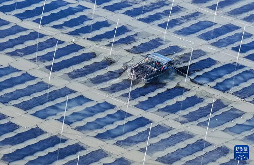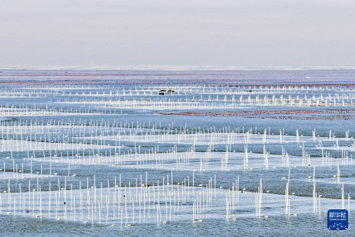 1月8日,漁民在江蘇連云港市海州灣漁場(chǎng)養(yǎng)殖區(qū)收獲條斑紫菜(無(wú)人機(jī)照片)。(新華社發(fā) 王健民 攝)
