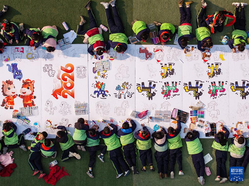 1月14日,榮縣樹人小學(xué)校的學(xué)生們在畫布上畫馬(無人機(jī)照片)。(新華社發(fā) 何海洋 攝)