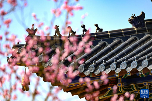 1月14日拍攝的南京梅花山景區(qū)梅花與建筑相映成趣。(新華社發(fā) 孫忠南 攝)