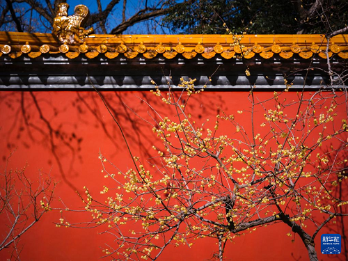 1月11日在南京明孝陵景區(qū)拍攝的臘梅與紅墻相映成景。(新華社發(fā) 蘇陽 攝)
