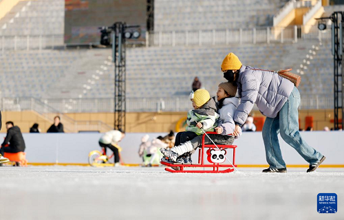 1月17日,孩子們?cè)阢y川文旅集團(tuán)覽山公園落日冰場(chǎng)玩耍。(新華社記者 王鵬 攝)