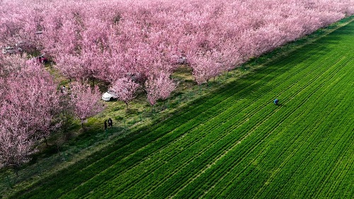 3月11日拍攝的西安市鄠邑區(qū)甘河街道丁村的梅花種植園(無人機(jī)照片)。(新華社記者 鄒競一 攝)