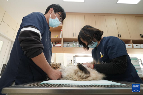2月3日,在無(wú)錫關(guān)愛寵物醫(yī)院,醫(yī)護(hù)人員給寵物貓?zhí)昝?。(新華社發(fā) 劉臻睿 攝)