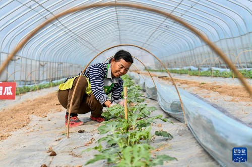 3月18日,山西省運(yùn)城市夏縣夏樂(lè)精品瓜業(yè)合作社的工作人員在管護(hù)西瓜苗。(新華社記者 曹陽(yáng) 攝)