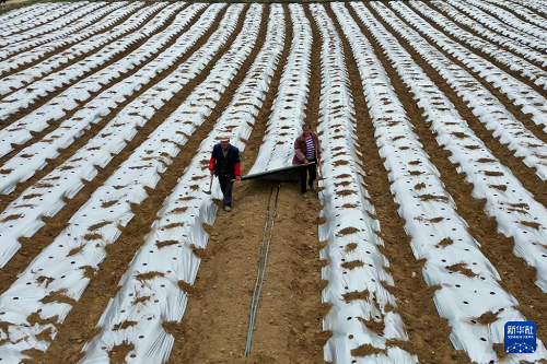 3月25日,貴州省畢節(jié)市赫章縣興發(fā)苗族彝族回族鄉(xiāng)農民在田間進行覆膜作業(yè)(無人機照片)。(新華社發(fā) 江子鈺 攝)