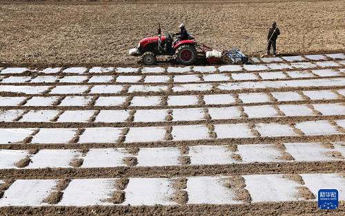 4月1日,農(nóng)機(jī)手駕駛農(nóng)機(jī)在甘肅省天水市武山縣馬力鎮(zhèn)的田間覆地膜春耕。(新華社發(fā) 王克賢 攝)