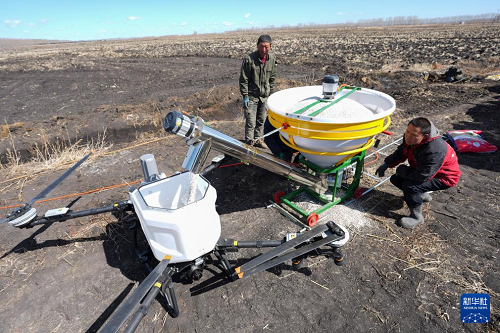 在黑龍江省雙鴨山市的黑龍江北大荒農(nóng)業(yè)股份有限公司友誼分公司第九管理區(qū),農(nóng)戶將稻田肥料放置到農(nóng)業(yè)無人機(jī)中(4月9日攝)。(新華社記者 王松 攝)