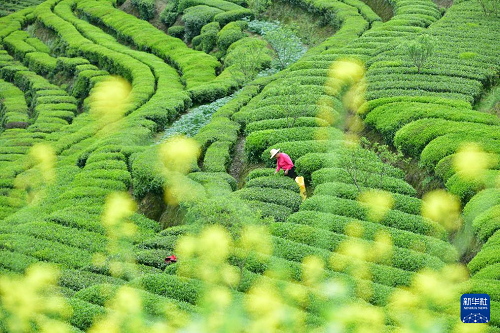 4月12日,在湖北省十堰市鄖陽區(qū)青山鎮(zhèn)九里崗村茶葉基地,采茶工在采茶葉。(新華社發(fā) 曹忠宏 攝)
