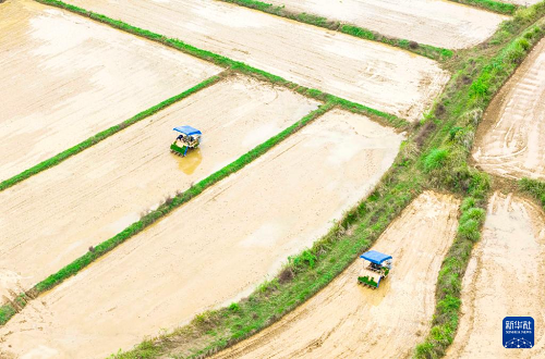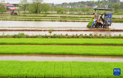 4月11日,湖南省衡陽市祁東縣金橋鎮(zhèn)村民駕駛插秧機(jī)進(jìn)行早稻插秧工作。(新華社發(fā) 曹正平 攝)