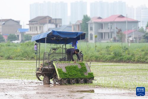 4月16日,在湖南省益陽市南縣南洲鎮(zhèn),工人在調整插秧機。(新華社記者 陳振海 攝)