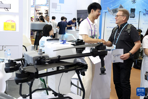 4月15日,采購商在廣交會(huì)現(xiàn)場參觀選購無人機(jī)。(新華社記者 盧漢欣 攝)