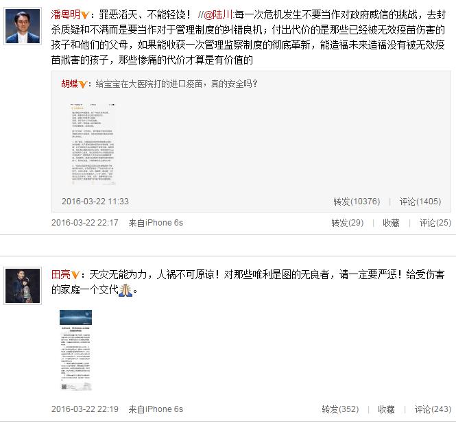 主持人胡蝶對疫苗產(chǎn)生莫大的質(zhì)疑,稱:“給寶寶在大醫(yī)院打的進口疫苗,真的安全嗎?”隨后,陸川轉(zhuǎn)發(fā)此微博,并寫道:“每一次危機發(fā)生不要當作對政府威信的挑戰(zhàn),去封殺質(zhì)疑和不滿而是要當作對于管理制度的糾錯良機;付出代價的是那些已經(jīng)被無效疫苗傷害的孩子和他們的父母,如果能收獲一次管理監(jiān)察制度的徹底革新,能造福未來造福沒有被無效疫苗戕害的孩子,那些慘痛的代價才算是有價值的。”潘粵明也寫在微博下“罪惡滔天、不能輕饒”的話語。