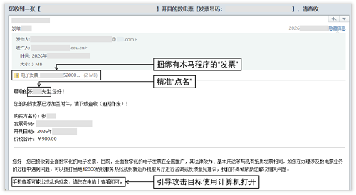 “【電子發(fā)票】張某某先生,您的發(fā)票已開好,請點擊下載”——當收件箱彈出這類帶著你真實姓名的電子郵件,你是否會下意識點擊?注意!這可能是境外間諜情報機關(guān)實施的精準網(wǎng)絡(luò)攻擊。一旦點擊郵件中的附件或者鏈接,設(shè)備將瞬間淪為間諜竊密的“突破口”,安全風(fēng)險隨之而來。
