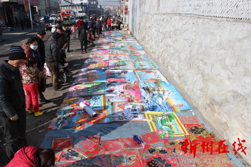 2月1日,在原平市新原鄉(xiāng)解放街村的農(nóng)貿(mào)市場上,村民們正在選購年畫。過年了,不少農(nóng)村都在集市上選購年畫、春聯(lián)、窗花、燈籠、掛件,準(zhǔn)備過個(gè)祥和喜慶的猴年春節(jié)。(曹申義 攝)