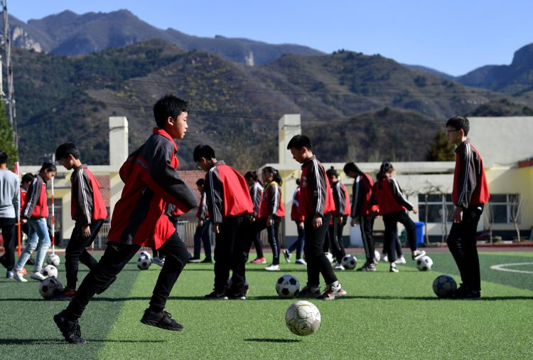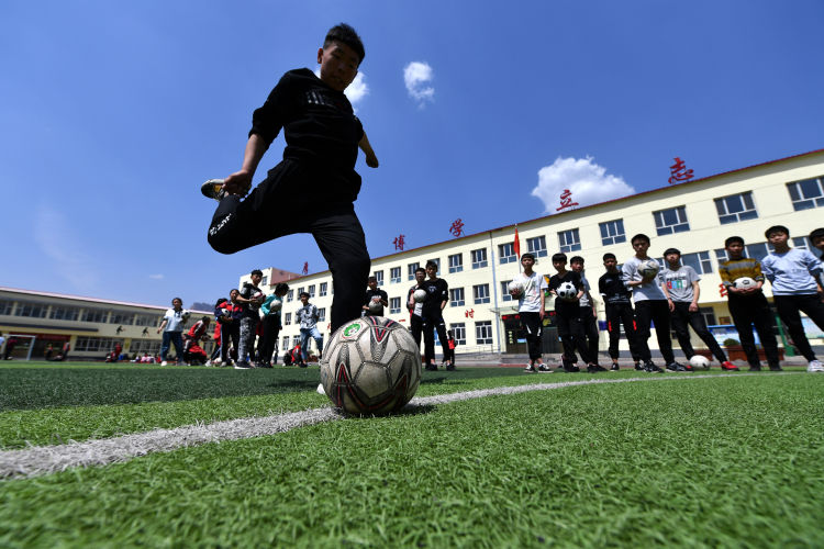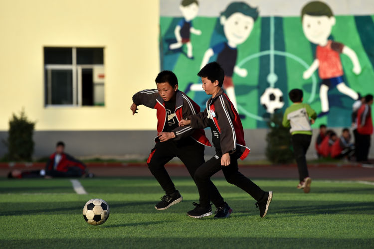 ↑這是學(xué)生們下課后在球場(chǎng)上踢足球(4月17日攝)。新華社記者詹