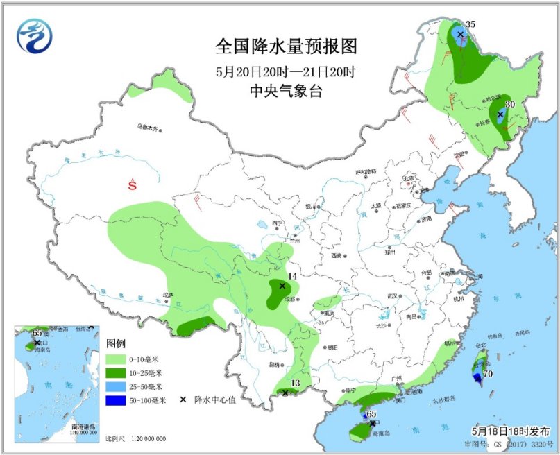 5月20日20時至21日20時,四川盆地西部、黑龍江西北部和東南部、吉林東北部、廣東西南部、廣西東南部、海南島東北部等地的部分地區(qū)有中到大雨,局地有暴雨(50~65毫米)。內(nèi)蒙古東部、東北地區(qū)中南部、華北北部、黃淮東部等地的部分地區(qū)有4~6級風(fēng)。南疆盆地等地局地有浮塵或揚(yáng)沙。