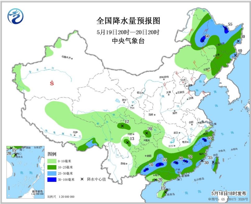 5月19日20時至20日20時,內(nèi)蒙古東北部、東北地區(qū)中北部、江南南部和東部、華南大部等地的部分地區(qū)有中到大雨,局地有暴雨(50~70毫米)。內(nèi)蒙古中東部、華北、黃淮、東北地區(qū)中南部等地的部分地區(qū)有4~6級風(fēng),陣風(fēng)7~8級。南疆盆地等地局地有揚(yáng)沙或浮塵。渤海西南部海域?qū)⒂?~8級、陣風(fēng)9~10級的西北風(fēng)。