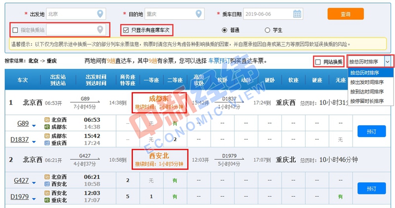 2、換乘過(guò)程中,存在同站換乘和不同車(chē)站換乘兩種情況。在列車(chē)余票信息頁(yè)面,旅客可根據(jù)需求,對(duì)“指定換乘站”“只顯示有座席車(chē)次”“同站換乘”等信息進(jìn)行勾選。此外,車(chē)票信息還可以根據(jù)總歷時(shí)、出發(fā)、到達(dá)、停留時(shí)間進(jìn)行排序。