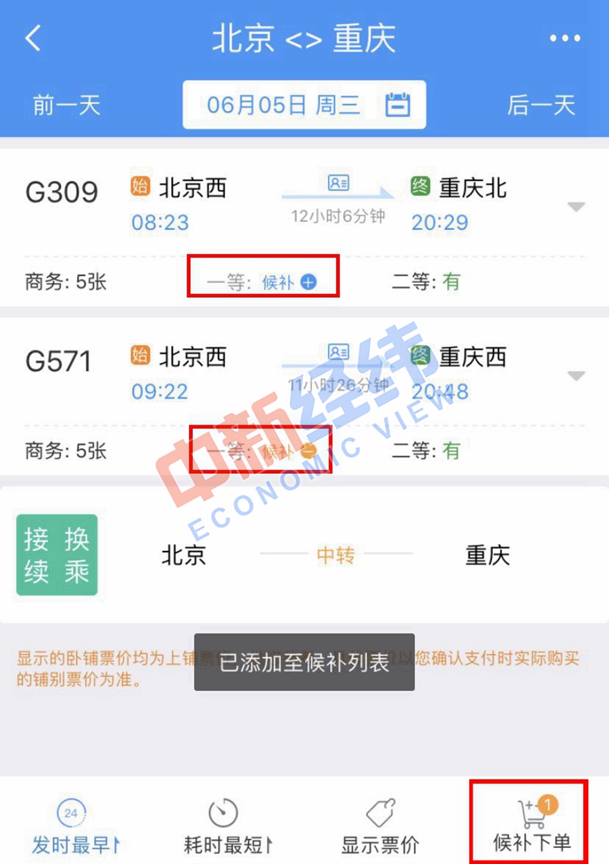 2、沒(méi)余票的車(chē)次會(huì)直接顯示“候補(bǔ)”字樣,點(diǎn)擊“候補(bǔ)”即可放入候補(bǔ)列表,候補(bǔ)列表中可以查看車(chē)次、排位等信息。