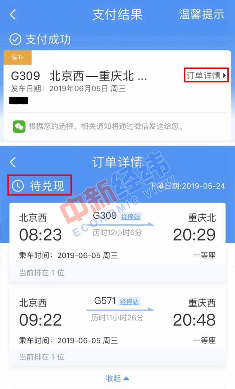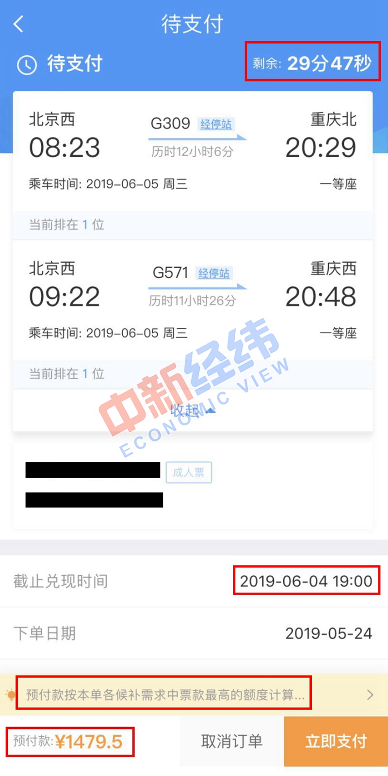 5、支付候補(bǔ)訂單。值得注意的是,候補(bǔ)訂單的支付需要在30分鐘內(nèi)完成,預(yù)付款按本單各候補(bǔ)需求中票款最高的額度計(jì)算。如果候補(bǔ)成功(即在兌現(xiàn)時(shí)間前搶到車(chē)票),預(yù)付票款中多出的部分,將自動(dòng)退回差額給原賬戶;如果候補(bǔ)購(gòu)票失敗(即在兌現(xiàn)時(shí)間前未搶到車(chē)票),預(yù)付款將全額退回。