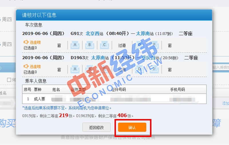 4、一切準(zhǔn)備就緒后,就可進(jìn)行車(chē)票預(yù)訂了。點(diǎn)擊“預(yù)訂”后,系統(tǒng)會(huì)再次對(duì)換乘信息進(jìn)行提示,確認(rèn)無(wú)誤后選擇對(duì)應(yīng)車(chē)次所需席別,添加乘車(chē)人信息。