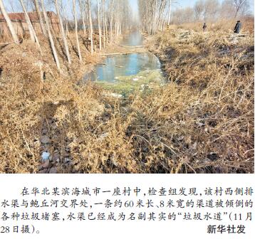 在華北某濱海城市一座村中,檢查組發(fā)現(xiàn),該村西側(cè)排水渠與鮑丘河交界處,一條約60米長、8米寬的渠道被傾倒的各種垃圾堵塞,水渠已經(jīng)成為名副其實(shí)的“垃圾水道”。而在該村東北水渠河長公示牌附近就有生活污水直接排入,水面漂浮綠色青苔、白色泡沫,散發(fā)刺鼻惡臭。