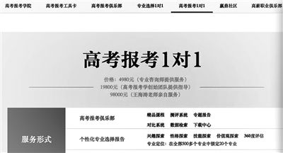 北青報記者發(fā)現(xiàn),面對考生家長對于志愿填報的“迫切需求”,目前高考志愿填報咨詢的價格都在幾千元到幾萬元不等。這位潘姓工作人員表示,該機構(gòu)設(shè)有線上、線下志愿填報兩套方案,其中線上填報方案價格為3980元,志愿填報咨詢老師與學(xué)生并不見面,而是通過QQ、郵件等方式為學(xué)生和家長出具志愿填報方案。而線下志愿填報方案為1對1有針對性的填報,但是根據(jù)咨詢經(jīng)驗的多寡收費也不相同?!氨热缥覀冇衅甙四晷袠I(yè)經(jīng)驗的呂老師收費是22800元,有6年經(jīng)驗的郭老師收費是20800元,要是有3年經(jīng)驗的李老師收費則為16800元?!贝送?,一家名為融聚未來的機構(gòu)的高姓負(fù)責(zé)人也向記者介紹,該機構(gòu)高考志愿填報1對1服務(wù)的價格在8000元到2萬元以內(nèi)。最讓人吃驚的是,一家名為贏鼎教育的高考報考機構(gòu),在官網(wǎng)上明示的高考報考1對1項目中明確標(biāo)價,專業(yè)咨詢師提供服務(wù)的收費4980元,高考報考學(xué)創(chuàng)始團隊提供指導(dǎo)的收費為19800元,王海濤老師親自服務(wù)的標(biāo)價為98000元。