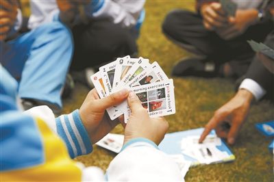 學(xué)生們?cè)谕嫣锞虐l(fā)明的“英語(yǔ)撲克”。劉磊 攝
