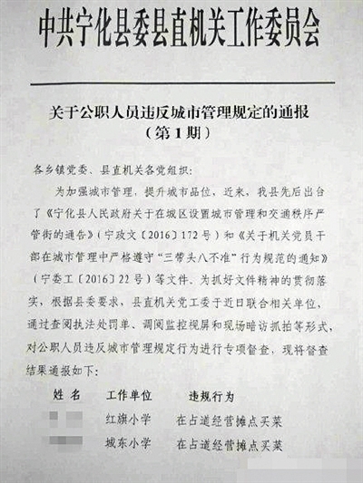 爭(zhēng)議由一份通報(bào)文件開(kāi)始。網(wǎng)傳圖片顯示,一份抬頭為“中共寧化縣委縣直機(jī)關(guān)工作委員會(huì)”的《關(guān)于公職人員違反城市管理規(guī)定的通報(bào)》中,寧化縣針對(duì)公職人員違反城市管理規(guī)定行為進(jìn)行專(zhuān)項(xiàng)督查,并對(duì)部分公職人員進(jìn)行了公開(kāi)通報(bào)。其中,文件第一頁(yè)列明,兩名工作單位分別為紅旗小學(xué)和城東小學(xué)的教師,因?yàn)椤霸谡嫉澜?jīng)營(yíng)攤點(diǎn)買(mǎi)菜”的違規(guī)行為,受到通報(bào)處理。
