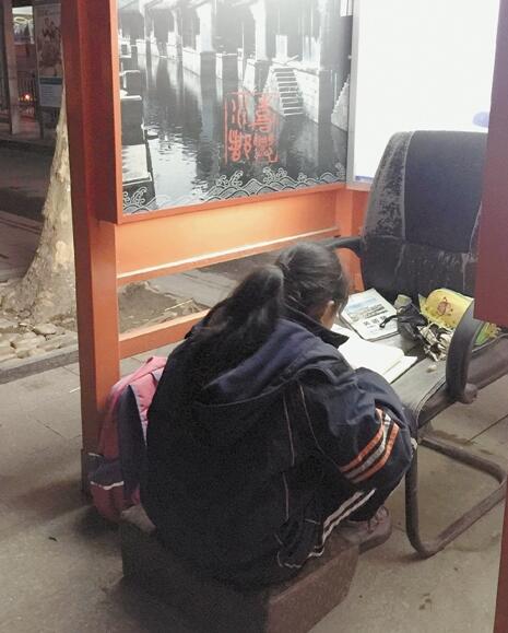 照片上這個(gè)四面漏風(fēng)的電話(huà)亭,是嘉興12歲女孩曉華的“書(shū)房”,一把舊椅子當(dāng)書(shū)桌,沙發(fā)坐墊當(dāng)?shù)首?,每天借著昏暗的照明燈看?shū)做作業(yè)。