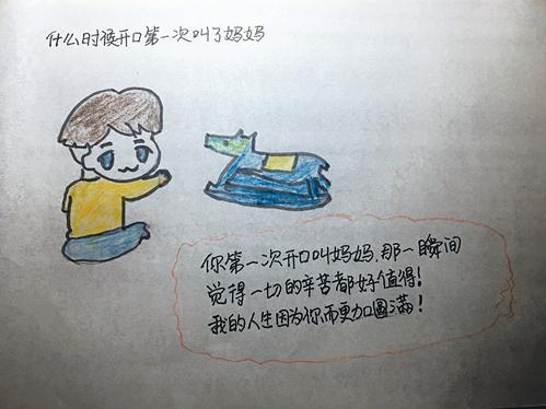 漫畫中,媽媽抱著襁褓里的嬰兒傷心地哭泣著,這是焦洋畫的漫畫中的一幅,是最揪心的一幅漫畫。旁邊配著焦洋用中性筆工工整整寫的大片文字?!耙?yàn)榍闆r危急,媽媽早產(chǎn)一個月,你出生就要和媽媽分開,你被送去另一個醫(yī)院……媽媽每天祈禱,盼著你快快出院,終于在半個月后把你從醫(yī)院抱回來,那是媽媽第一次抱你,看著你個小人兒從此與我息息相關(guān)。仿佛那一瞬間明白了責(zé)任是什么,謝謝你寶貝,讓我邁入人生的另一個階段?!?br /> 焦洋今年33歲,在8年前,她生下兒子派派。孩子的出生并不順利,早產(chǎn)了一個月,因?yàn)槿毖?,醫(yī)生甚至都建議家人放棄這條小生命??墒墙寡髨?jiān)決不放棄,只要有一絲希望就得拼盡全力?!爸宦牭揭宦暱奁缶捅会t(yī)生抱走,放進(jìn)保溫箱,我都沒看到他的模樣,讓我放棄,絕對不會同意的?!苯寡笳f,因?yàn)楹⒆右怀錾臓顩r非常糟糕,她只好獨(dú)自出院,留下還在保溫箱里的孩子。