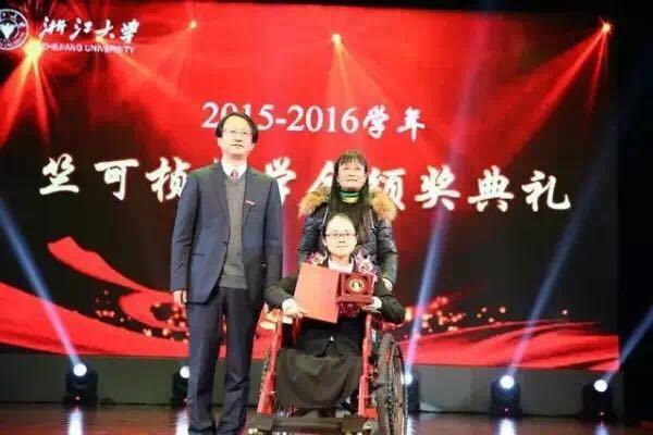 竺可楨獎學金是浙江大學最高層次的獎學金,要通過本人申請,學院(系)推薦,校獎學金評審委員會評定,每次評選全校范圍內的研究生只有12個名額。在2016年10月份公布的獲獎者中,葉沈俏名列其中?!白约核惚容^幸運的,還能看書,可以打字?!比~沈俏說,“同學和老師還是很關愛我的,努力學習、認真科研是向他們表達感謝的手段,這也是我最好的興趣?!眻D為浙江大學校長吳朝暉為葉沈俏頒發(fā)竺可楨獎學金。