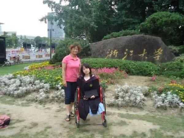 高考時,葉沈俏以全省名次靠前的優(yōu)異成績,被浙江大學錄取。如愿被浙大錄取后,那年初秋,葉媽媽就開始背著葉沈俏穿梭在浙大紫金港校區(qū)各個教室上課?!拔覌寢屖俏业囊粋€勇敢的榜樣,身體力行地告訴我,我可以依靠自己的努力做一個獨立有價值的人。”葉沈俏說。2010年的一次期末考試后,天空正在下雪,越來越大,別的同學早已急匆匆地考完試回家。地滑路濕,葉媽媽便穿上雨衣推著輪椅慢慢走在浙大校園里。葉沈俏說:“那一刻我覺得自己是最幸福的人,我不能放棄,而要更加努力?!眻D為葉沈俏本科畢業(yè)時與母親的合照。