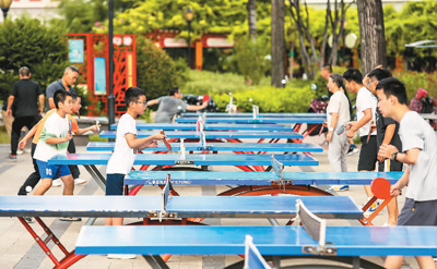 8月8日,在山東省滕州市弘道公園內(nèi),市民正在打乒乓球。宋海存攝(人民視覺)