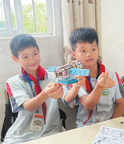 “這是航天衛(wèi)星的兩翼,是安裝太陽能電池板的地方?!眮碜詮V西壯族自治區(qū)梧州市藤縣第五小學(xué)的三年級學(xué)生李杰峰驕傲地展示著親手組裝的模型,他希望將來能從事航天工作。