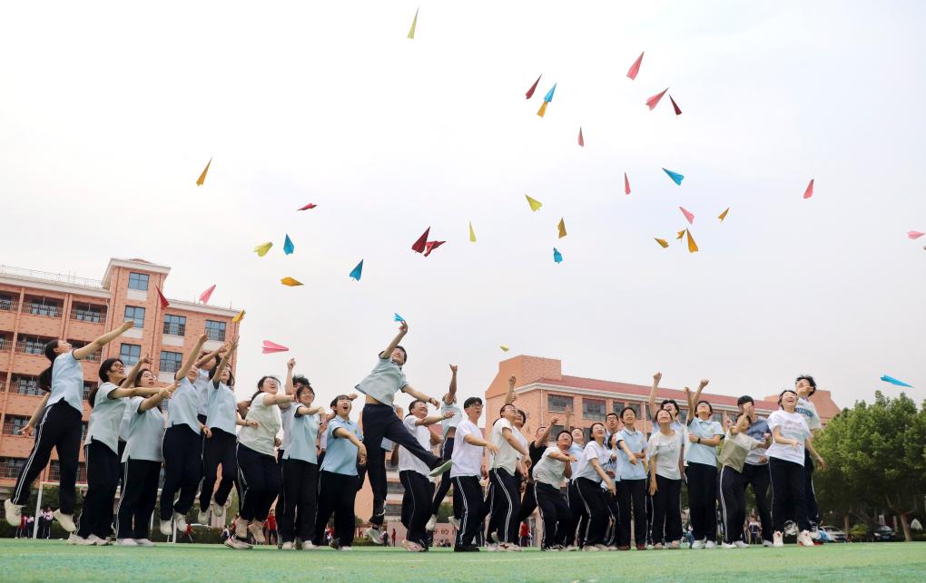 5月22日,在山東省高密市第五中學,高三學生將寫有夢想的紙飛機拋向空中。高考臨近,各地學校組織高三學生開展不同形式的減壓活動,幫助學生放松心情,迎接高考。新華社發(fā)(李海濤攝)