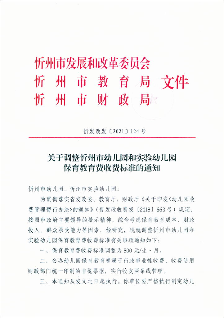 關(guān)于調(diào)整忻州市幼兒園和實驗幼兒園保育教育費收費標準的通知