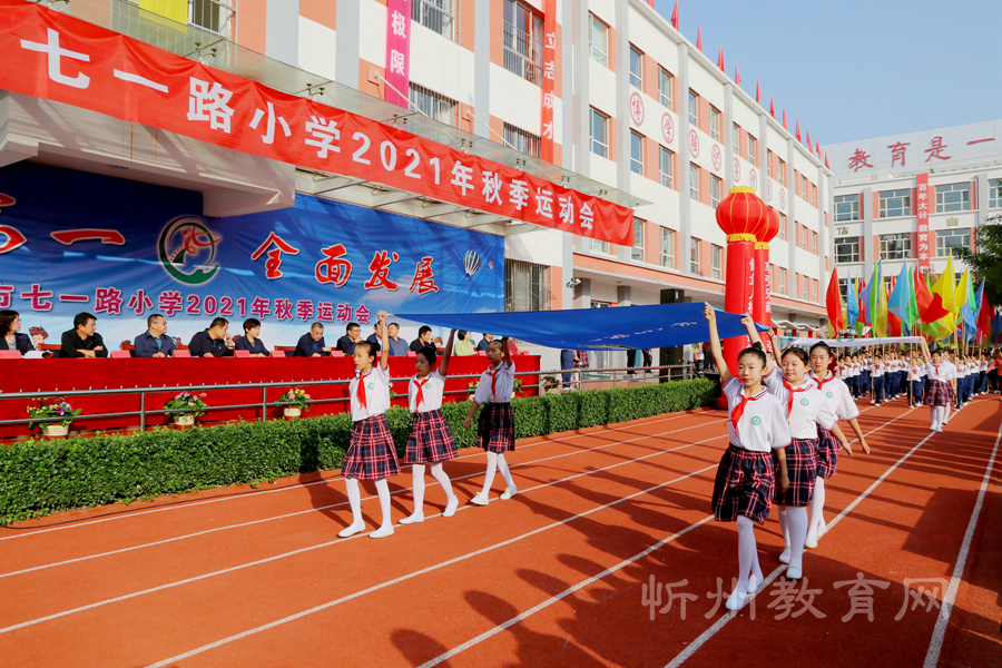 最后,靳茂文書記宣布忻州市七一路小學2021年秋季運動會開幕,運動員代表退場,團體操表演開始。