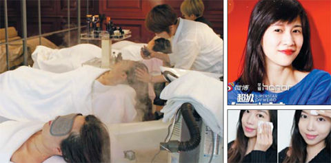 今年3月,在首爾新沙洞林蔭道,中國“網紅”們正在接受愛茉莉太平洋用韓方洗發(fā)水產品進行的頭皮護理。右上方的圖片,是papi醬上月16日在上海進行的粉絲見面會海報。下方的圖片是“網紅”周倩晗今年3月在自己微博上發(fā)布的韓國化妝品體驗后記。