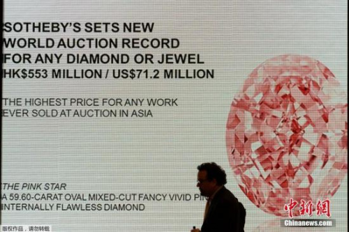 中新網(wǎng)4月5日電 據(jù)外媒報(bào)道,近日,重達(dá)59.60克拉、一顆被稱為“粉紅之星”的罕見鉆石在香港拍賣的價(jià)格超過了7100萬(wàn)美元,刷新了全球鉆石的拍賣紀(jì)錄。