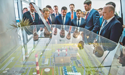 中國和俄羅斯合資建設(shè)的華電捷寧斯卡婭燃?xì)庹羝?lián)合循環(huán)供熱電站項目投產(chǎn)儀式6月20日在俄羅斯雅羅斯拉夫爾市舉行。圖為嘉賓參觀華電捷寧斯卡婭電站項目沙盤模型。新華社發(fā)