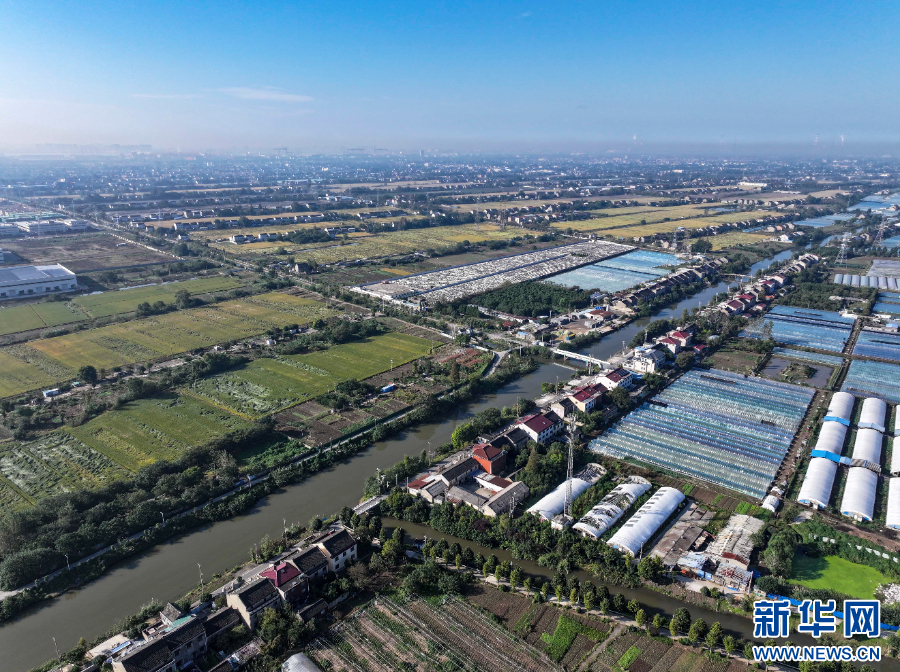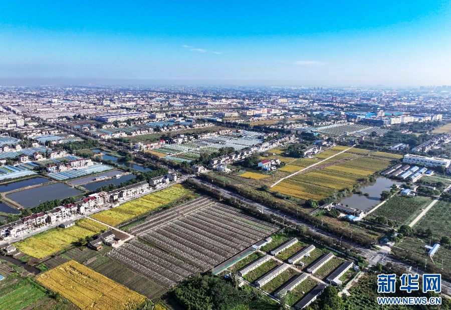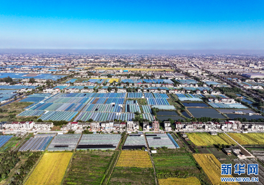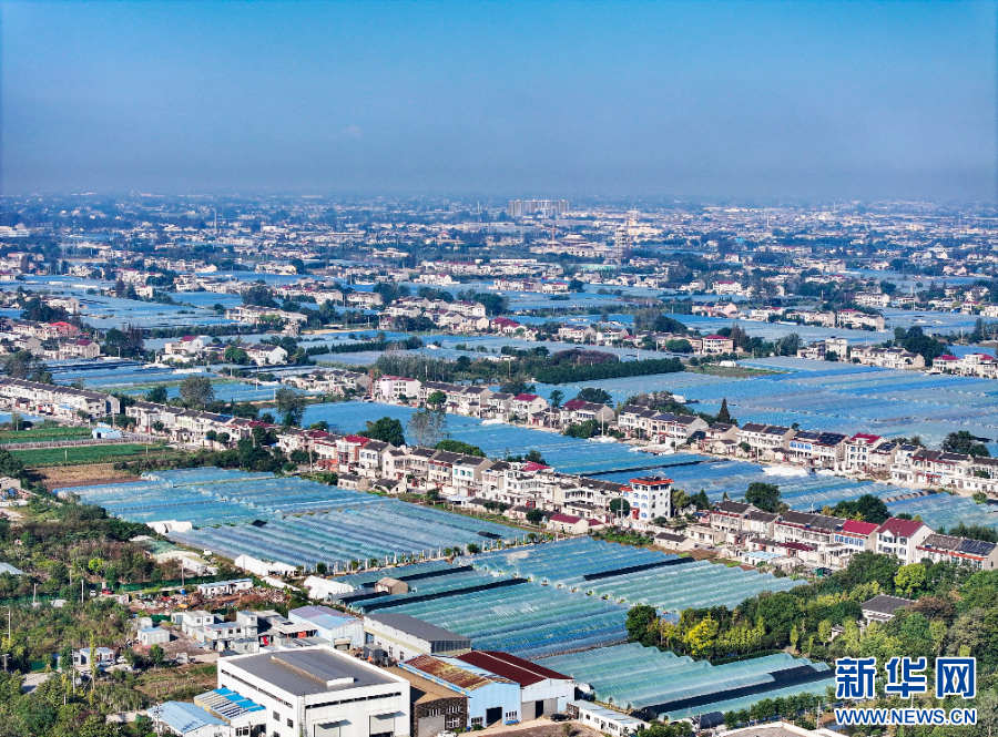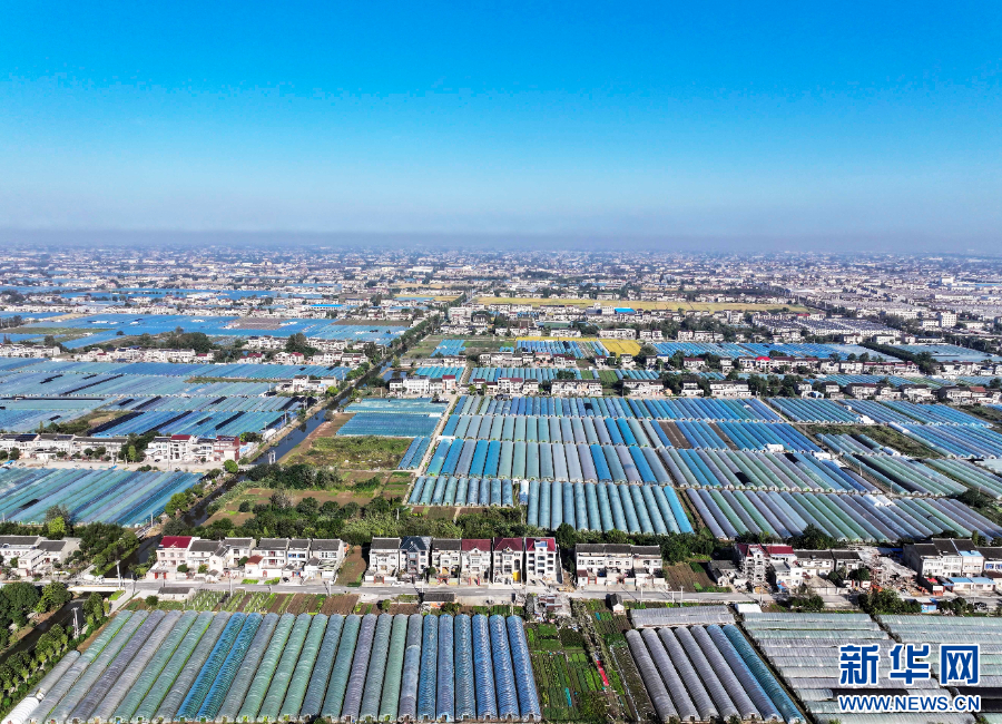 深秋時節(jié),從空中俯瞰江蘇省靖江市馬橋鎮(zhèn)橫港村,整片的蔬菜大棚、錯落有致的民居,田園風光美如畫卷。