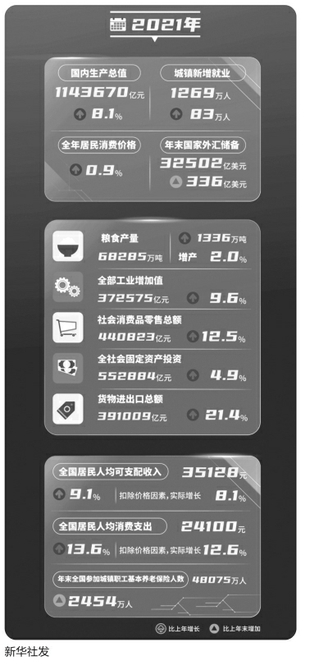 國(guó)家統(tǒng)計(jì)局2月28日發(fā)布的2021年國(guó)民經(jīng)濟(jì)和社會(huì)發(fā)展統(tǒng)計(jì)公報(bào)顯示,2021年,面對(duì)百年變局和世紀(jì)疫情,全國(guó)上下共同努力,我國(guó)經(jīng)濟(jì)發(fā)展和疫情防控保持全球領(lǐng)先地位,構(gòu)建新發(fā)展格局邁出新步伐,高質(zhì)量發(fā)展取得新成效,實(shí)現(xiàn)了“十四五”良好開局。