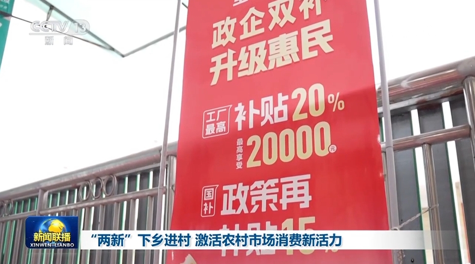 央視網(wǎng)消息(新聞聯(lián)播):“兩新”政策實(shí)施以來(lái),各地通過(guò)擴(kuò)大補(bǔ)貼范圍、優(yōu)化服務(wù)等措施,將實(shí)惠和便利送到鄉(xiāng)村,激發(fā)農(nóng)村市場(chǎng)消費(fèi)活力。