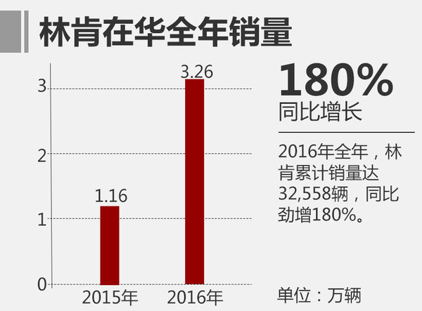 在陸續(xù)引入四款新車(chē)后,隨著產(chǎn)品線(xiàn)的逐漸豐富,開(kāi)始走“親民”路線(xiàn)的林肯在重回中國(guó)市場(chǎng)后銷(xiāo)量大幅攀升。較之2015年的11,630輛,2016年全年林肯累計(jì)銷(xiāo)量達(dá)32,558輛,同比勁增180%,其增速成為中國(guó)成長(zhǎng)最快的豪華品牌。在第四季度,林肯單月銷(xiāo)量達(dá)11,562輛,占全年銷(xiāo)量的35.5%,同比增幅162%。
