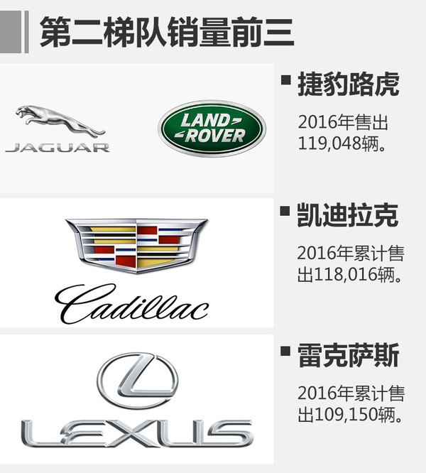 而包括捷豹路虎、凱迪拉克、雷克薩斯、沃爾沃、英菲尼迪、林肯和謳歌組成的豪華品牌第二梯隊(duì),2016年總銷(xiāo)量為520,354輛,占整個(gè)豪華車(chē)市場(chǎng)23.9%。注:保時(shí)捷品牌定位問(wèn)題,不算在第二梯隊(duì)內(nèi)。