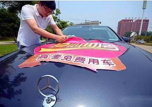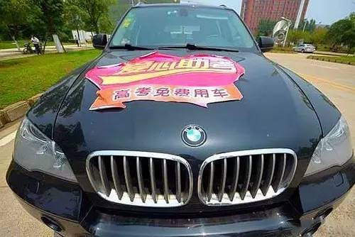 瑪莎拉蒂、路虎、奔馳、寶馬……等十輛豪車在路邊一字排開,每輛車的發(fā)動機蓋上都貼著“高考免費用車”的標語,盡管低調但車隊還是吸引了眾人的目光。