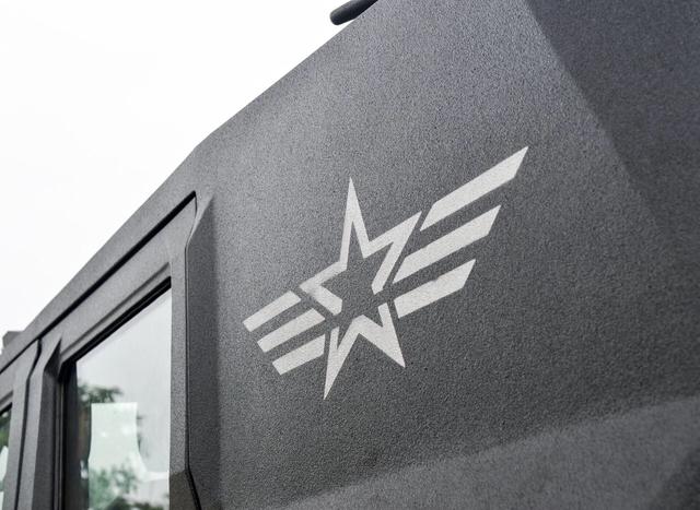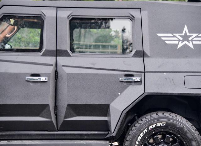 車身表面使用了亞光色涂裝,披上厚重的鋼板并經(jīng)過高溫噴砂處理,車窗采用了高強(qiáng)度復(fù)合玻璃,厚度比起一臺(tái)iPhone7還要厚。幾乎全車做過了防彈處理和碳纖維處理,側(cè)面還取消了C柱和D柱,換裝了具有一定防爆能力的輪胎,據(jù)說輪胎支持在全部破損的情況下勻速行駛。
