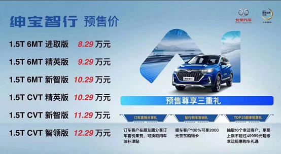 據(jù)悉,從8月31日成都車(chē)展開(kāi)始,北京汽車(chē)已經(jīng)啟動(dòng)了紳寶智行預(yù)售活動(dòng),并推出訂車(chē)喜悅分享禮、智行購(gòu)車(chē)答謝禮、TOP10超幸鉅惠禮三重大禮,最高能省49999元。